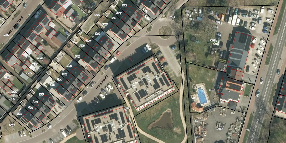 Het perceel waarop Bloemenhof 80 staat heeft een oppervlakte van 2185 m². Dit is een zeer groot perceel. De perceeloppervlakte wordt geregistreerd door het Kadaster. Gedetailleerde informatie over de maten van dit perceel kunt u vinden in het rapport Kadastrale kaart met maatvoering van Bloemenhof 80.