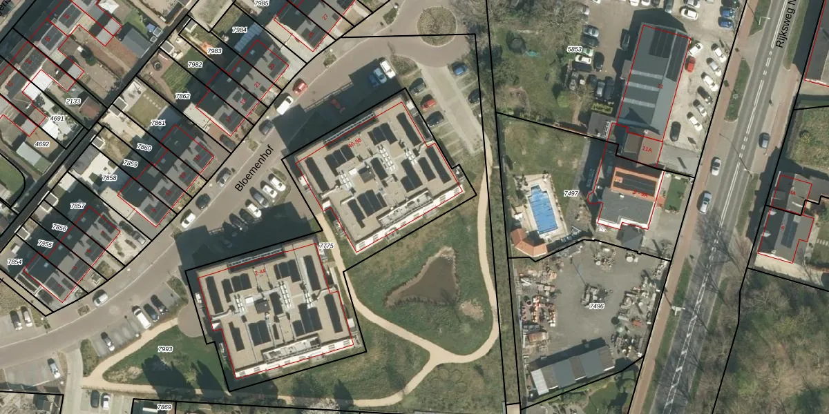 Het perceel waarop Bloemenhof 86 staat heeft een oppervlakte van 2185 m². Dit is een zeer groot perceel. De perceeloppervlakte wordt geregistreerd door het Kadaster. Gedetailleerde informatie over de maten van dit perceel kunt u vinden in het rapport Kadastrale kaart met maatvoering van Bloemenhof 86.