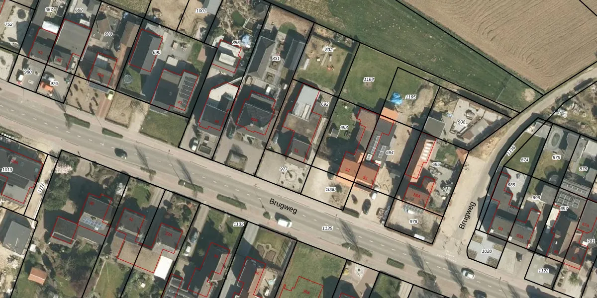 Het perceel waarop Brugweg 51 staat heeft een oppervlakte van 400 m². Dit is een groot perceel. De perceeloppervlakte wordt geregistreerd door het Kadaster. Gedetailleerde informatie over de maten van dit perceel kunt u vinden in het rapport Kadastrale kaart met maatvoering van Brugweg 51.