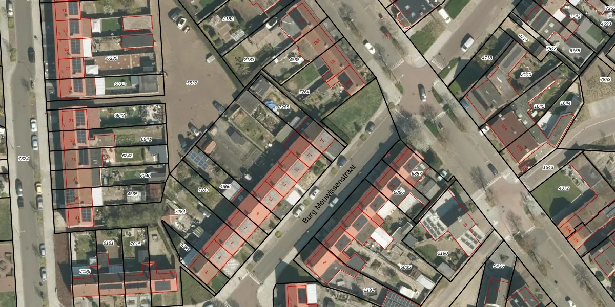 Het perceel waarop Burg Meuwissenstraat 17 staat heeft een oppervlakte van 1413 m². Dit is een zeer groot perceel. De perceeloppervlakte wordt geregistreerd door het Kadaster. Gedetailleerde informatie over de maten van dit perceel kunt u vinden in het rapport Kadastrale kaart met maatvoering van Burg Meuwissenstraat 17.