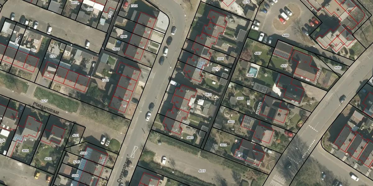 Het perceel waarop Cypresstraat 36 staat heeft een oppervlakte van 1599 m². Dit is een zeer groot perceel. De perceeloppervlakte wordt geregistreerd door het Kadaster. Gedetailleerde informatie over de maten van dit perceel kunt u vinden in het rapport Kadastrale kaart met maatvoering van Cypresstraat 36.