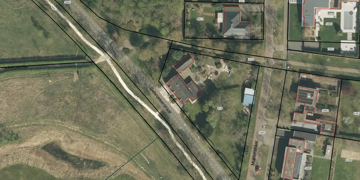 Het perceel waarop Gebroekerstraat 9 staat heeft een oppervlakte van 2200 m². Dit is een zeer groot perceel. De perceeloppervlakte wordt geregistreerd door het Kadaster. Gedetailleerde informatie over de maten van dit perceel kunt u vinden in het rapport Kadastrale kaart met maatvoering van Gebroekerstraat 9.