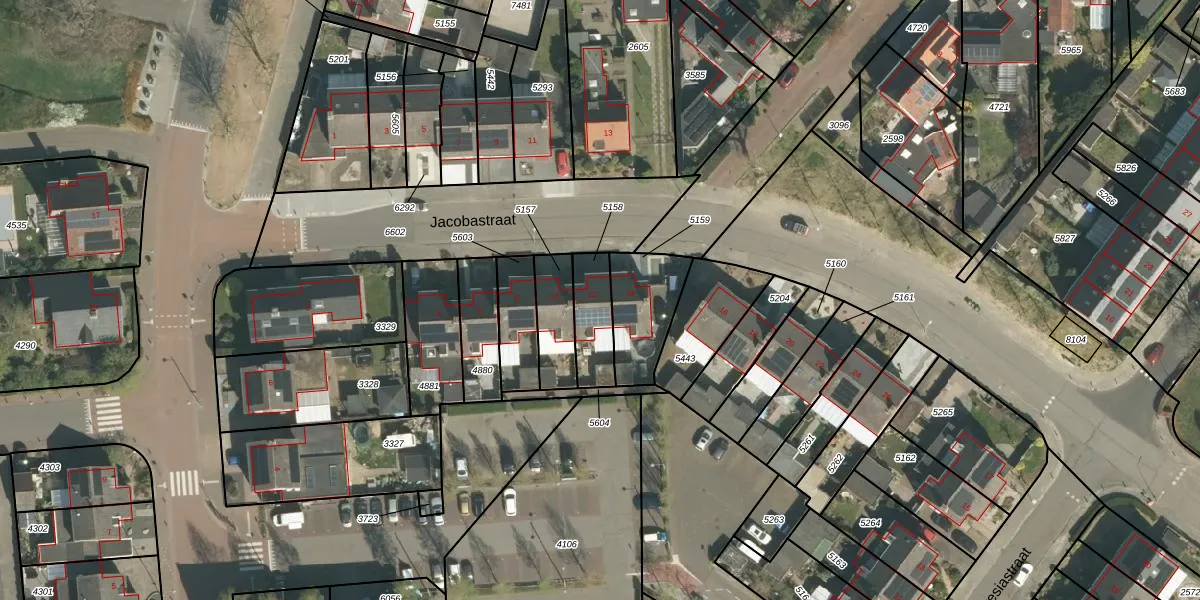 Jacobastraat 12 is gelegen op kadastraal perceel ECH00K5158. Deze kadastrale aanduiding is uniek en wordt gebruikt door het Kadaster om eigendomsrechten en andere zakelijke rechten vast te leggen. Het perceel maakt onderdeel uit van de kadastrale gemeente Echt.