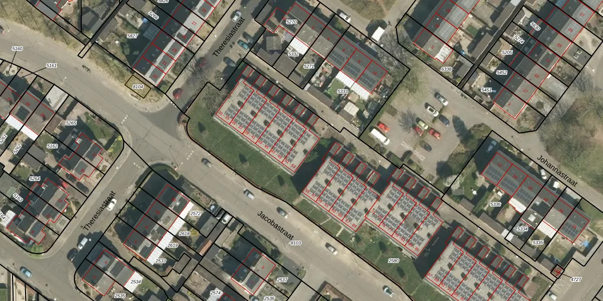 Het perceel waarop Jacobastraat 53 staat heeft een oppervlakte van 4225 m². Dit is een zeer groot perceel. De perceeloppervlakte wordt geregistreerd door het Kadaster. Gedetailleerde informatie over de maten van dit perceel kunt u vinden in het rapport Kadastrale kaart met maatvoering van Jacobastraat 53.