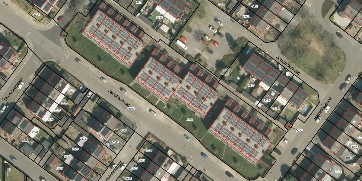 Het perceel waarop Jacobastraat 71 staat heeft een oppervlakte van 4225 m². Dit is een zeer groot perceel. De perceeloppervlakte wordt geregistreerd door het Kadaster. Gedetailleerde informatie over de maten van dit perceel kunt u vinden in het rapport Kadastrale kaart met maatvoering van Jacobastraat 71.
