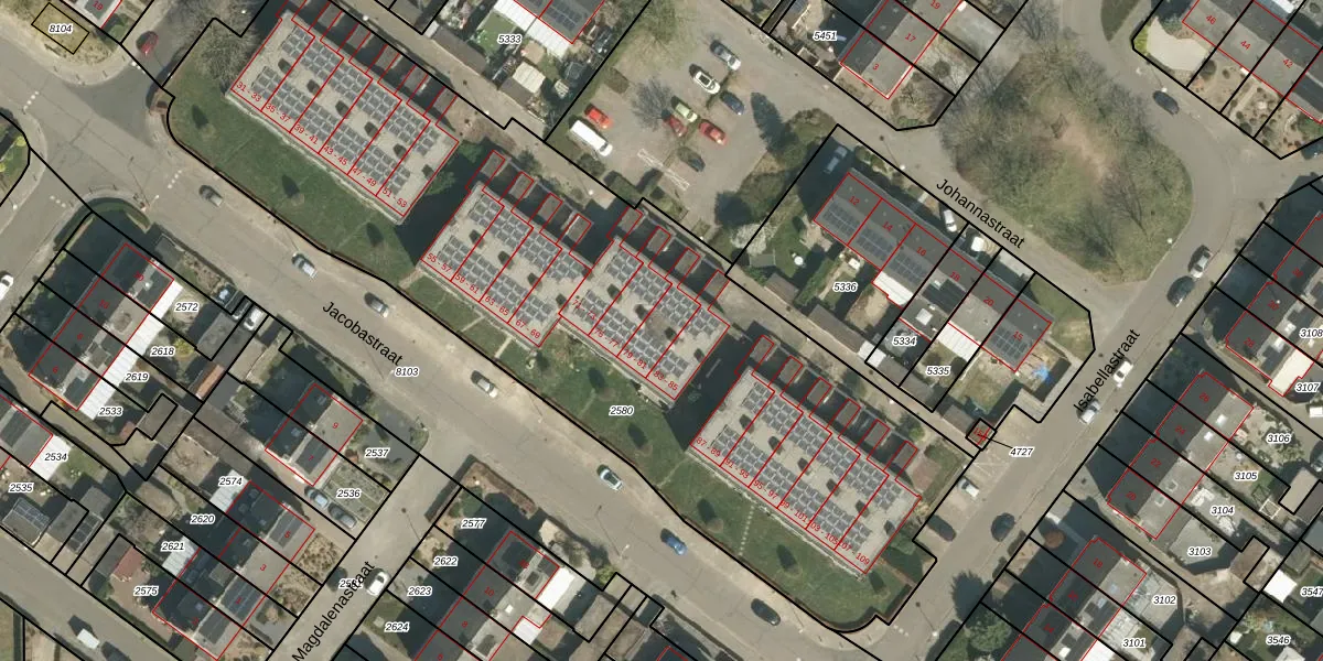 Het perceel waarop Jacobastraat 81 staat heeft een oppervlakte van 4225 m². Dit is een zeer groot perceel. De perceeloppervlakte wordt geregistreerd door het Kadaster. Gedetailleerde informatie over de maten van dit perceel kunt u vinden in het rapport Kadastrale kaart met maatvoering van Jacobastraat 81.