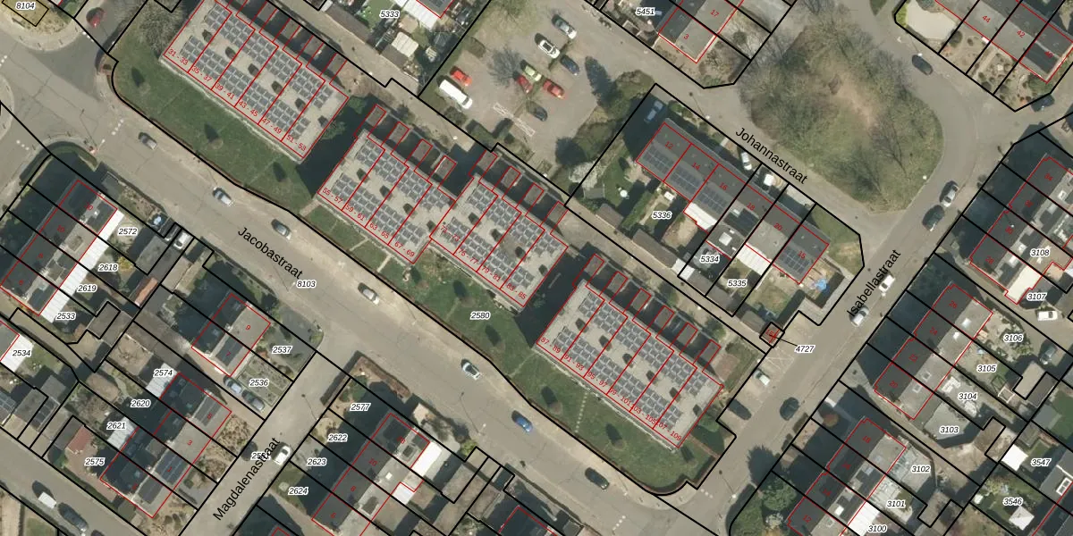 Het perceel waarop Jacobastraat 85 staat heeft een oppervlakte van 4225 m². Dit is een zeer groot perceel. De perceeloppervlakte wordt geregistreerd door het Kadaster. Gedetailleerde informatie over de maten van dit perceel kunt u vinden in het rapport Kadastrale kaart met maatvoering van Jacobastraat 85.