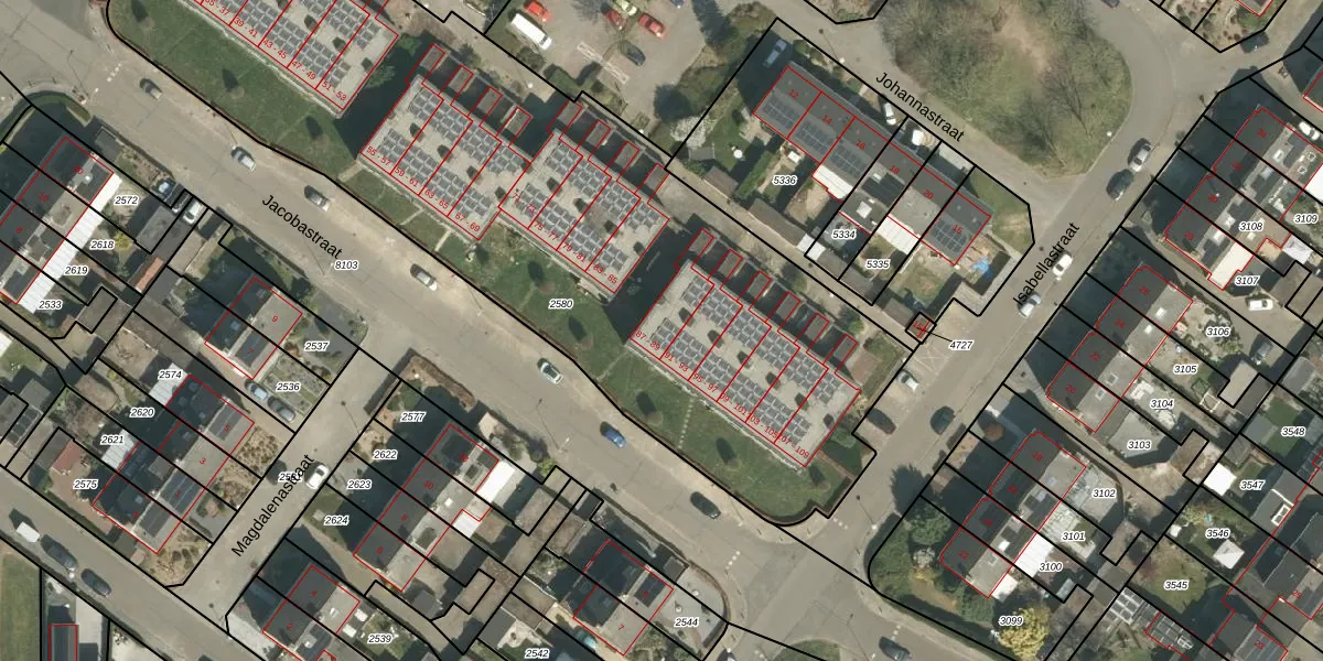 Het perceel waarop Jacobastraat 87 staat heeft een oppervlakte van 4225 m². Dit is een zeer groot perceel. De perceeloppervlakte wordt geregistreerd door het Kadaster. Gedetailleerde informatie over de maten van dit perceel kunt u vinden in het rapport Kadastrale kaart met maatvoering van Jacobastraat 87.