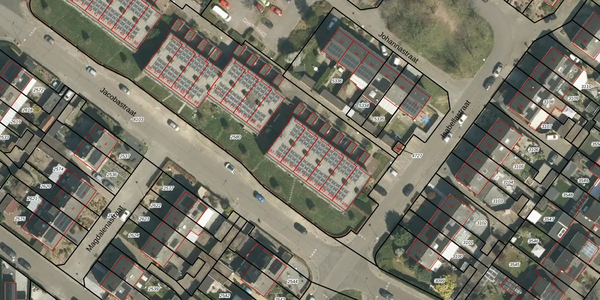 Het perceel waarop Jacobastraat 93 staat heeft een oppervlakte van 4225 m². Dit is een zeer groot perceel. De perceeloppervlakte wordt geregistreerd door het Kadaster. Gedetailleerde informatie over de maten van dit perceel kunt u vinden in het rapport Kadastrale kaart met maatvoering van Jacobastraat 93.
