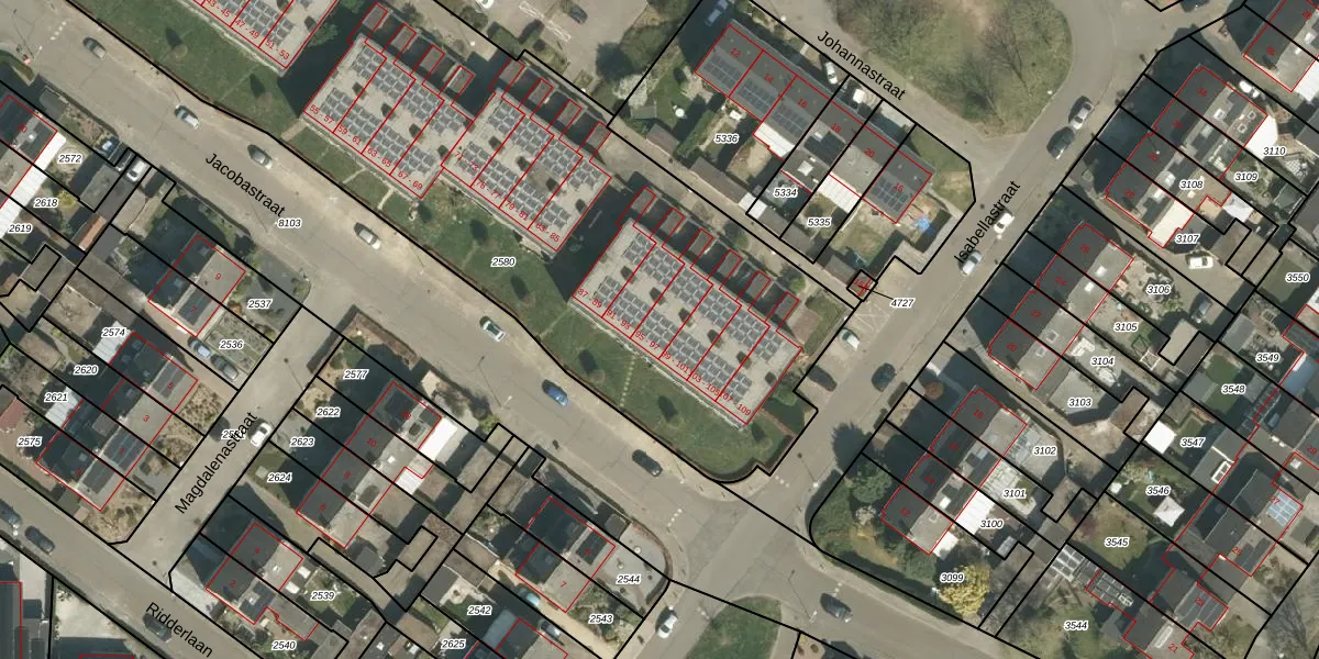 Het perceel waarop Jacobastraat 95 staat heeft een oppervlakte van 4225 m². Dit is een zeer groot perceel. De perceeloppervlakte wordt geregistreerd door het Kadaster. Gedetailleerde informatie over de maten van dit perceel kunt u vinden in het rapport Kadastrale kaart met maatvoering van Jacobastraat 95.