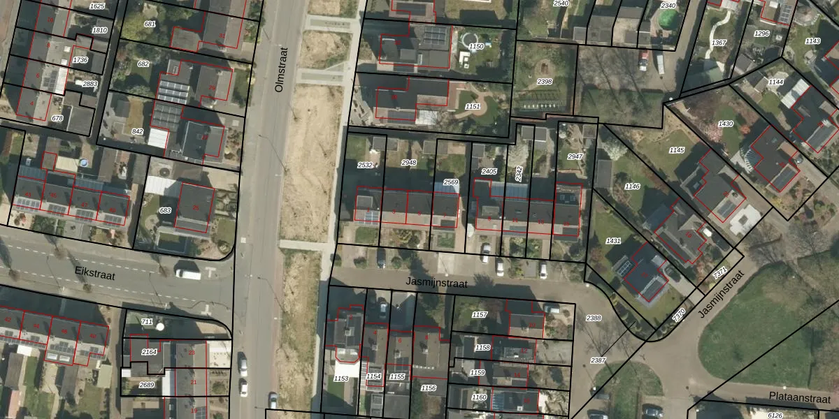 Het perceel waarop Jasmijnstraat 5 staat heeft een oppervlakte van 607 m². Dit is een groot perceel. De perceeloppervlakte wordt geregistreerd door het Kadaster. Gedetailleerde informatie over de maten van dit perceel kunt u vinden in het rapport Kadastrale kaart met maatvoering van Jasmijnstraat 5.