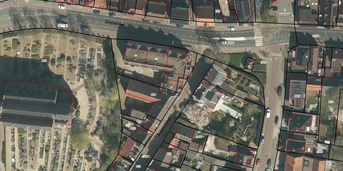 Het perceel waarop Jodenstraat 17 staat heeft een oppervlakte van 1075 m². Dit is een zeer groot perceel. De perceeloppervlakte wordt geregistreerd door het Kadaster. Gedetailleerde informatie over de maten van dit perceel kunt u vinden in het rapport Kadastrale kaart met maatvoering van Jodenstraat 17.