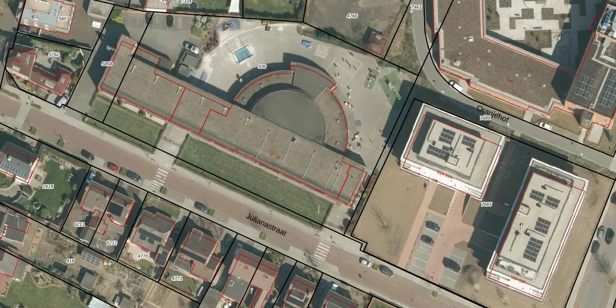 Het perceel waarop Julianastraat 27 staat heeft een oppervlakte van 4560 m². Dit is een zeer groot perceel. De perceeloppervlakte wordt geregistreerd door het Kadaster. Gedetailleerde informatie over de maten van dit perceel kunt u vinden in het rapport Kadastrale kaart met maatvoering van Julianastraat 27.