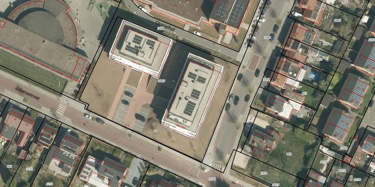 Het perceel waarop Julianastraat 53-F staat heeft een oppervlakte van 3830 m². Dit is een zeer groot perceel. De perceeloppervlakte wordt geregistreerd door het Kadaster. Gedetailleerde informatie over de maten van dit perceel kunt u vinden in het rapport Kadastrale kaart met maatvoering van Julianastraat 53-F.