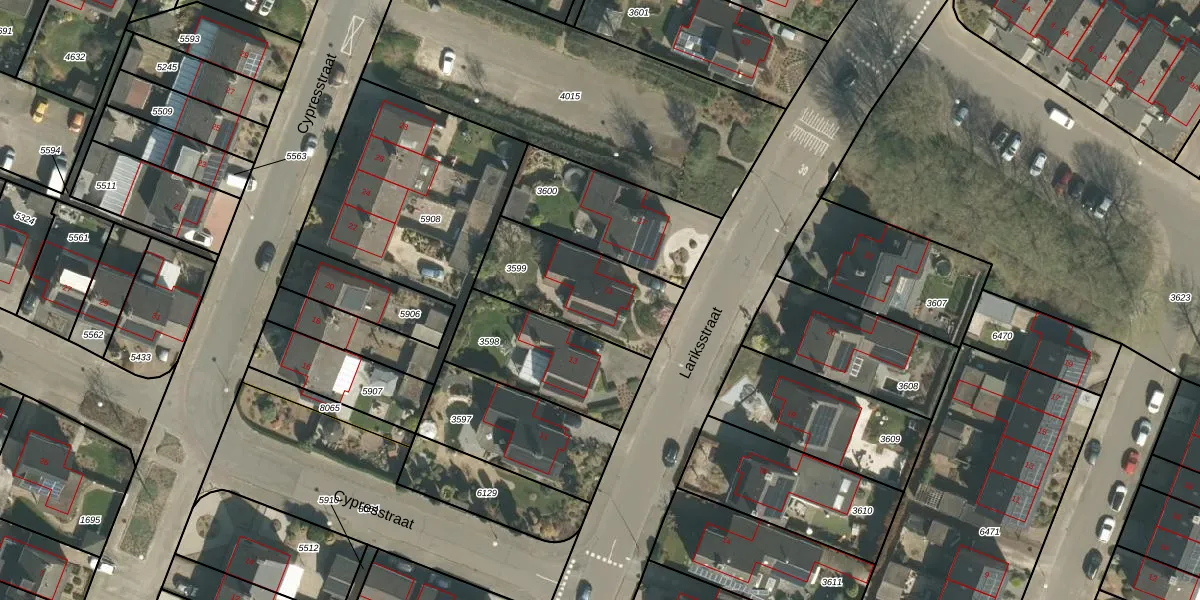 Het perceel waarop Lariksstraat 15 staat heeft een oppervlakte van 425 m². Dit is een groot perceel. De perceeloppervlakte wordt geregistreerd door het Kadaster. Gedetailleerde informatie over de maten van dit perceel kunt u vinden in het rapport Kadastrale kaart met maatvoering van Lariksstraat 15.