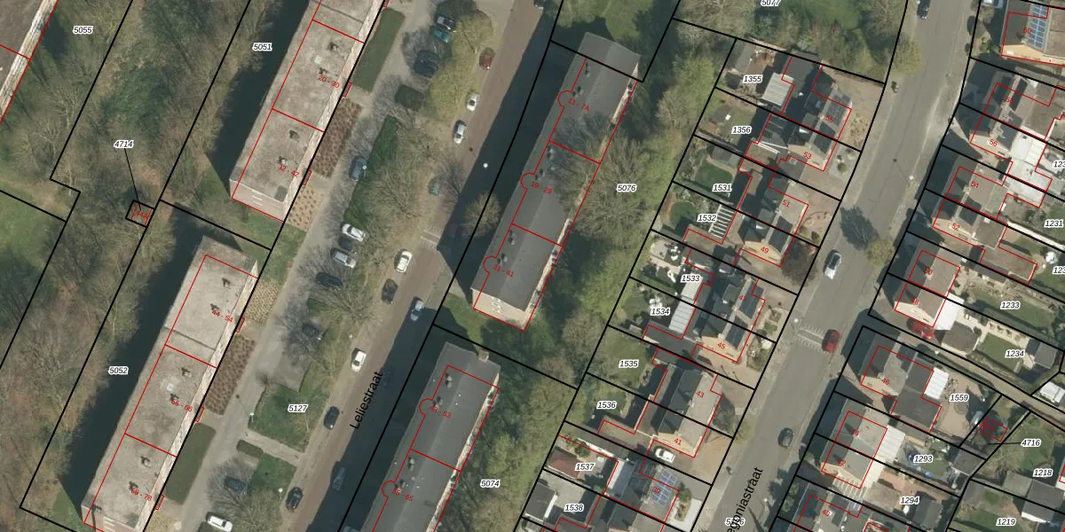 Het perceel waarop Leliestraat 33 staat heeft een oppervlakte van 1940 m². Dit is een zeer groot perceel. De perceeloppervlakte wordt geregistreerd door het Kadaster. Gedetailleerde informatie over de maten van dit perceel kunt u vinden in het rapport Kadastrale kaart met maatvoering van Leliestraat 33.