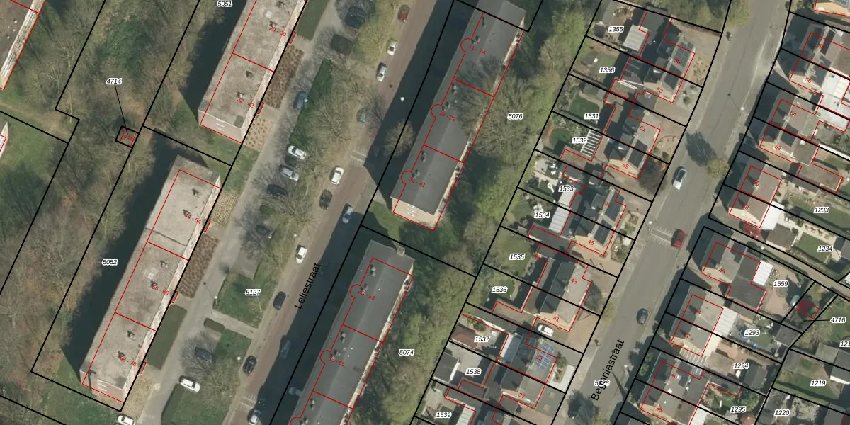 Het perceel waarop Leliestraat 39 staat heeft een oppervlakte van 1940 m². Dit is een zeer groot perceel. De perceeloppervlakte wordt geregistreerd door het Kadaster. Gedetailleerde informatie over de maten van dit perceel kunt u vinden in het rapport Kadastrale kaart met maatvoering van Leliestraat 39.