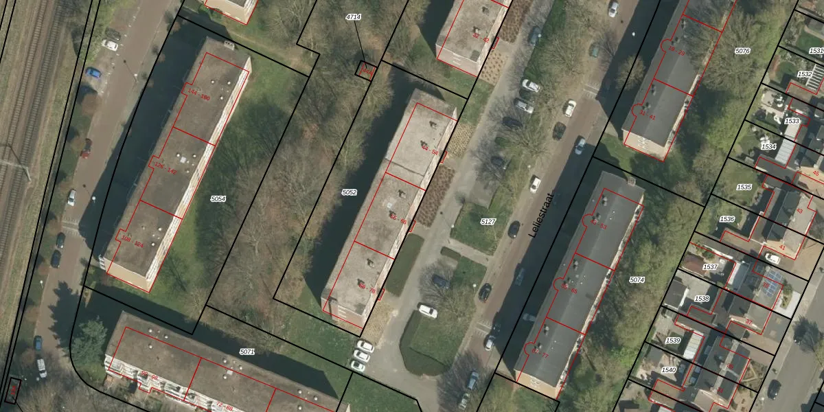 Het perceel waarop Leliestraat 56 staat heeft een oppervlakte van 1460 m². Dit is een zeer groot perceel. De perceeloppervlakte wordt geregistreerd door het Kadaster. Gedetailleerde informatie over de maten van dit perceel kunt u vinden in het rapport Kadastrale kaart met maatvoering van Leliestraat 56.