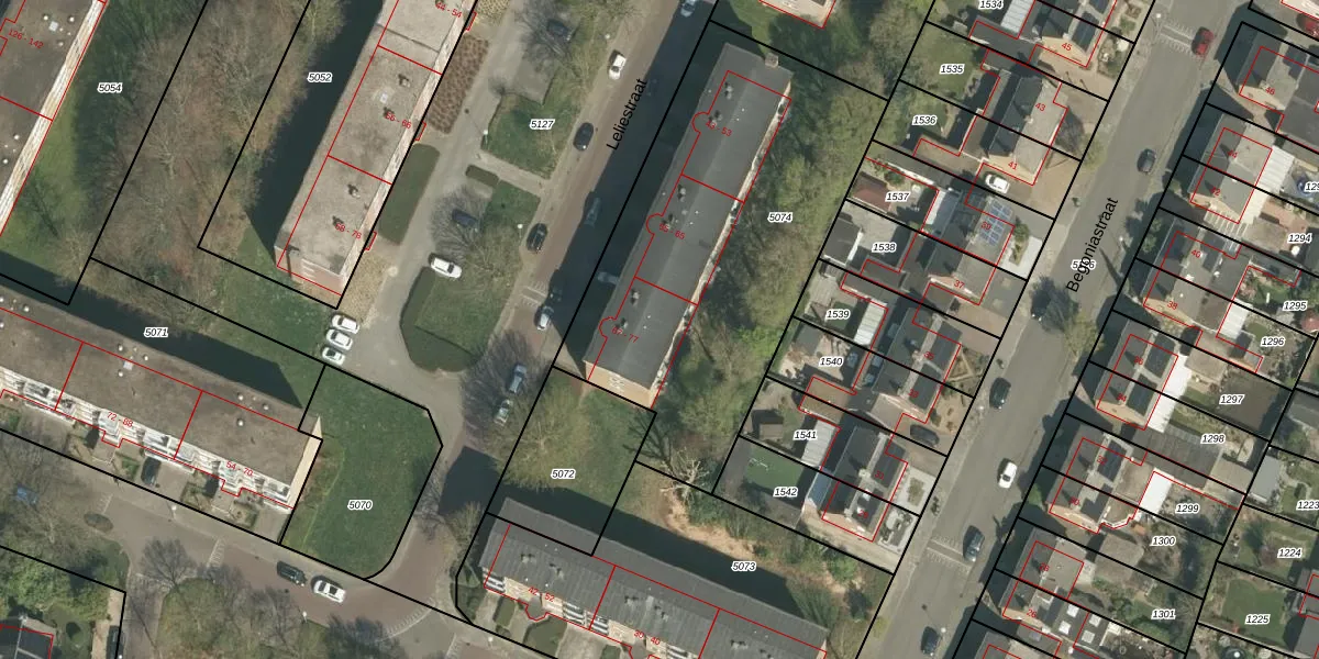 Het perceel waarop Leliestraat 69 staat heeft een oppervlakte van 1836 m². Dit is een zeer groot perceel. De perceeloppervlakte wordt geregistreerd door het Kadaster. Gedetailleerde informatie over de maten van dit perceel kunt u vinden in het rapport Kadastrale kaart met maatvoering van Leliestraat 69.