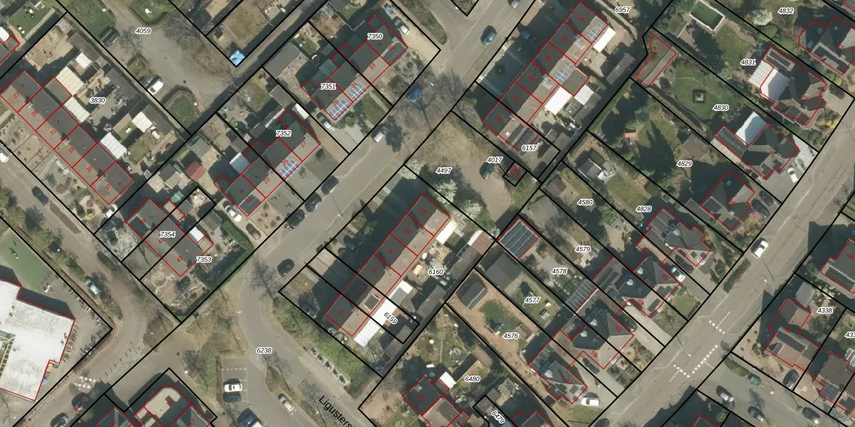 Het perceel waarop Ligusterstraat 12 staat heeft een oppervlakte van 1057 m². Dit is een zeer groot perceel. De perceeloppervlakte wordt geregistreerd door het Kadaster. Gedetailleerde informatie over de maten van dit perceel kunt u vinden in het rapport Kadastrale kaart met maatvoering van Ligusterstraat 12.