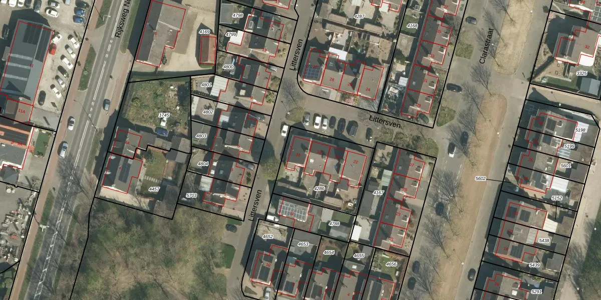 Het perceel waarop Littersven 16 staat heeft een oppervlakte van 675 m². Dit is een groot perceel. De perceeloppervlakte wordt geregistreerd door het Kadaster. Gedetailleerde informatie over de maten van dit perceel kunt u vinden in het rapport Kadastrale kaart met maatvoering van Littersven 16.