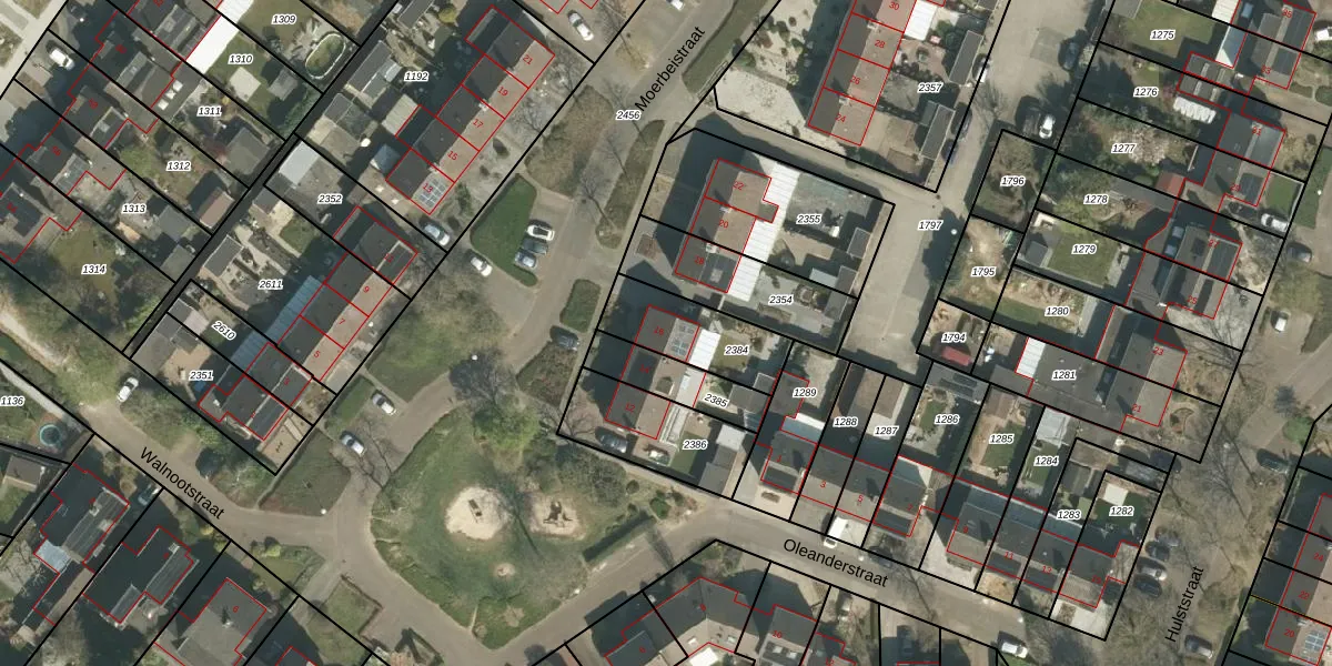 Het perceel waarop Moerbeistraat 16 staat heeft een oppervlakte van 257 m². Dit is een middelgroot perceel. De perceeloppervlakte wordt geregistreerd door het Kadaster. Gedetailleerde informatie over de maten van dit perceel kunt u vinden in het rapport Kadastrale kaart met maatvoering van Moerbeistraat 16.