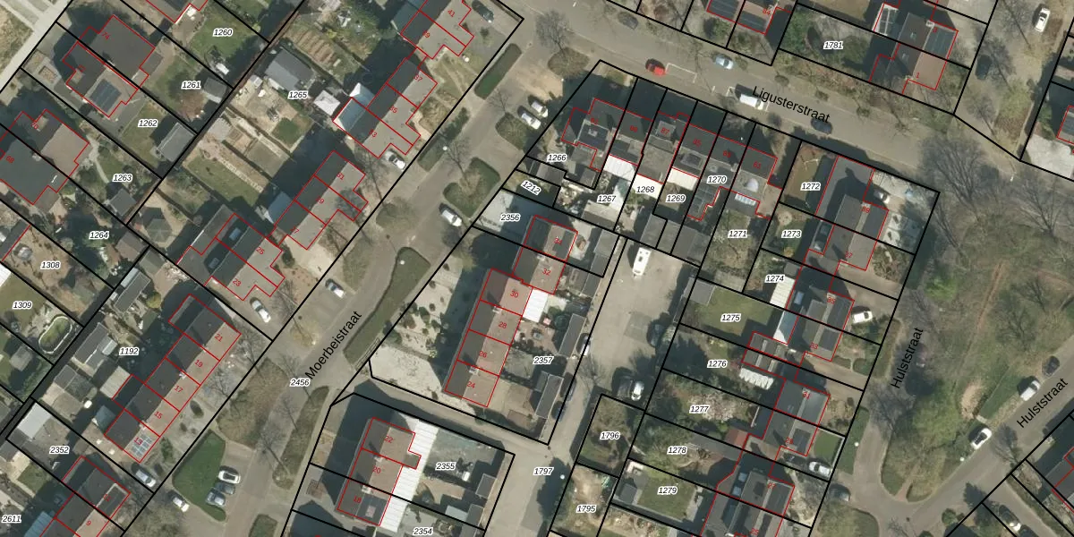 Het perceel waarop Moerbeistraat 32 staat heeft een oppervlakte van 1090 m². Dit is een zeer groot perceel. De perceeloppervlakte wordt geregistreerd door het Kadaster. Gedetailleerde informatie over de maten van dit perceel kunt u vinden in het rapport Kadastrale kaart met maatvoering van Moerbeistraat 32.