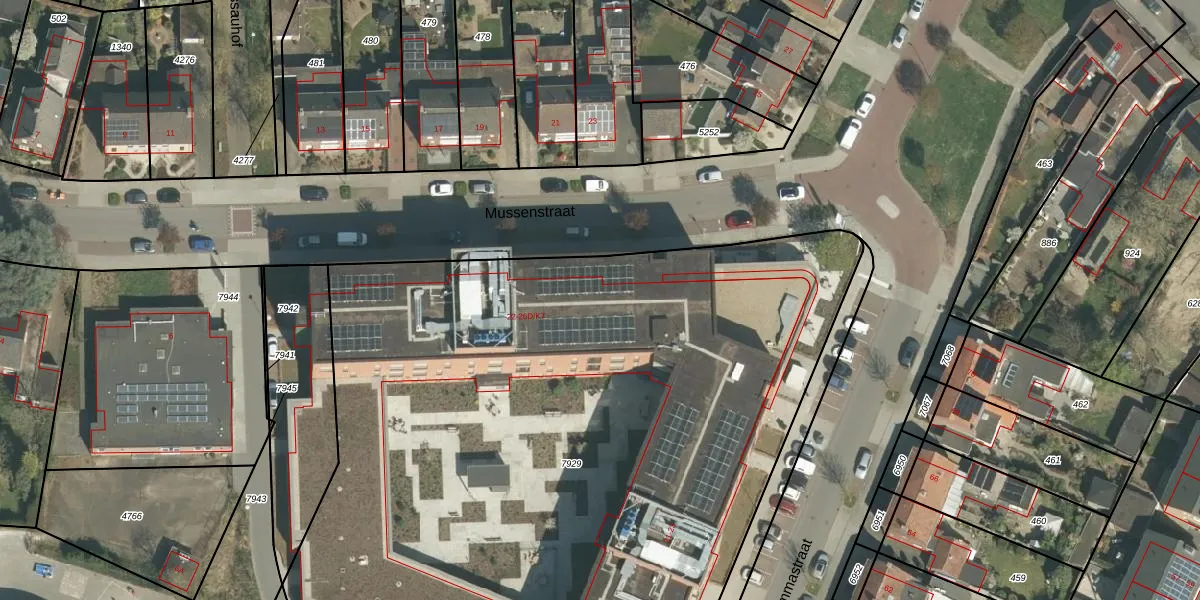 Het perceel waarop Mussenstraat 26-A-K2 staat heeft een oppervlakte van 5865 m². Dit is een zeer groot perceel. De perceeloppervlakte wordt geregistreerd door het Kadaster. Gedetailleerde informatie over de maten van dit perceel kunt u vinden in het rapport Kadastrale kaart met maatvoering van Mussenstraat 26-A-K2.