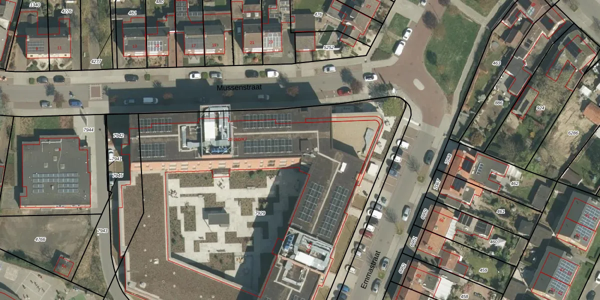 Het perceel waarop Mussenstraat 26-A-K12 staat heeft een oppervlakte van 5865 m². Dit is een zeer groot perceel. De perceeloppervlakte wordt geregistreerd door het Kadaster. Gedetailleerde informatie over de maten van dit perceel kunt u vinden in het rapport Kadastrale kaart met maatvoering van Mussenstraat 26-A-K12.