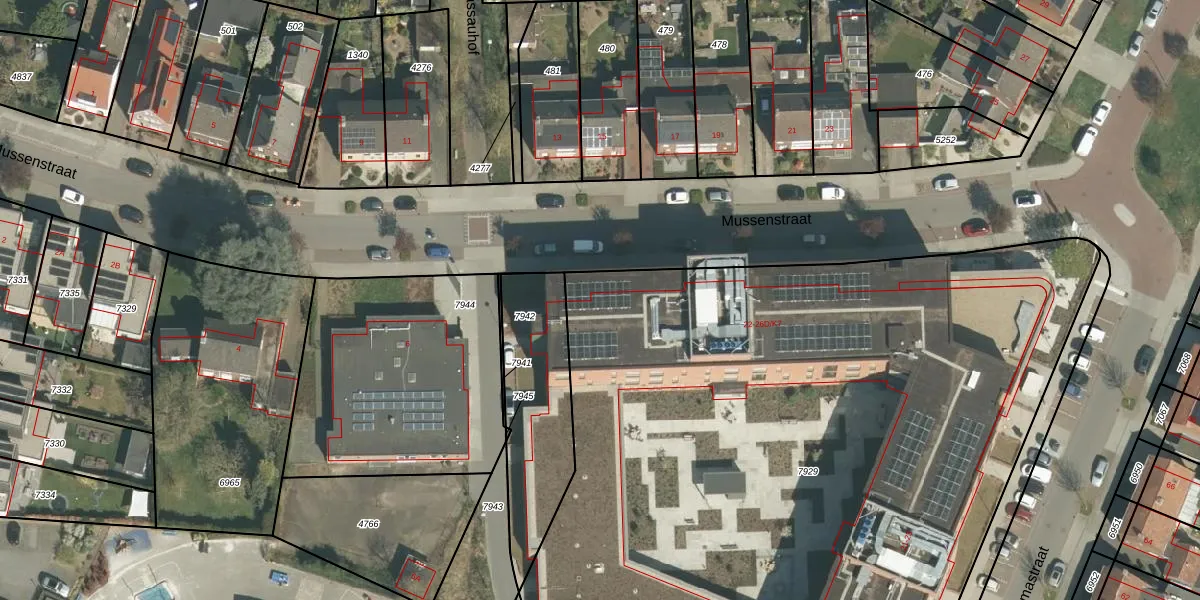 Het perceel waarop Mussenstraat 26-C-K5 staat heeft een oppervlakte van 5865 m². Dit is een zeer groot perceel. De perceeloppervlakte wordt geregistreerd door het Kadaster. Gedetailleerde informatie over de maten van dit perceel kunt u vinden in het rapport Kadastrale kaart met maatvoering van Mussenstraat 26-C-K5.