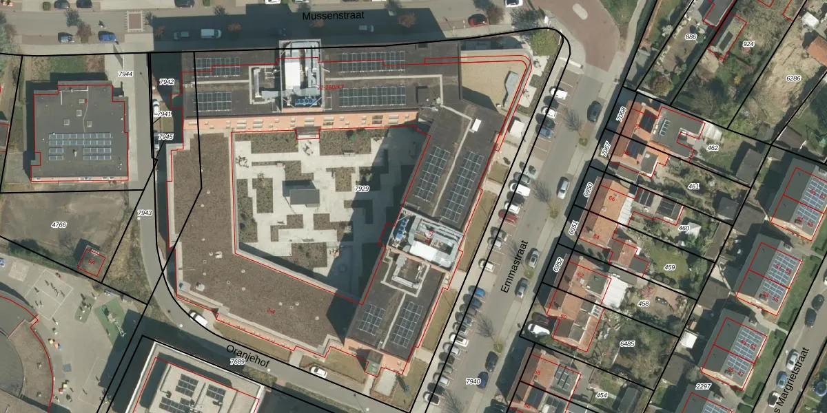 Het perceel waarop Mussenstraat 26-D-K10 staat heeft een oppervlakte van 5865 m². Dit is een zeer groot perceel. De perceeloppervlakte wordt geregistreerd door het Kadaster. Gedetailleerde informatie over de maten van dit perceel kunt u vinden in het rapport Kadastrale kaart met maatvoering van Mussenstraat 26-D-K10.