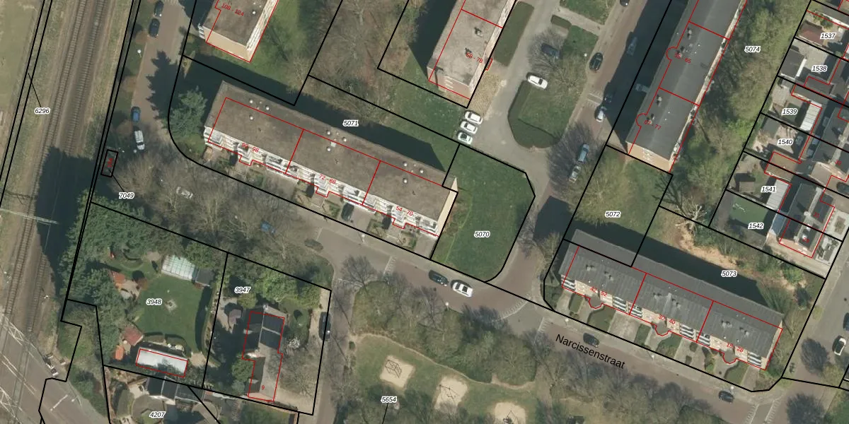 Het perceel waarop Narcissenstraat 54 staat heeft een oppervlakte van 1790 m². Dit is een zeer groot perceel. De perceeloppervlakte wordt geregistreerd door het Kadaster. Gedetailleerde informatie over de maten van dit perceel kunt u vinden in het rapport Kadastrale kaart met maatvoering van Narcissenstraat 54.