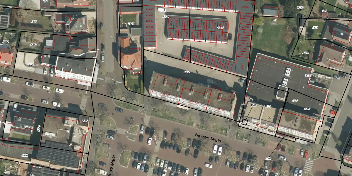 Het perceel waarop Nieuwe Markt 21 staat heeft een oppervlakte van 1492 m². Dit is een zeer groot perceel. De perceeloppervlakte wordt geregistreerd door het Kadaster. Gedetailleerde informatie over de maten van dit perceel kunt u vinden in het rapport Kadastrale kaart met maatvoering van Nieuwe Markt 21.