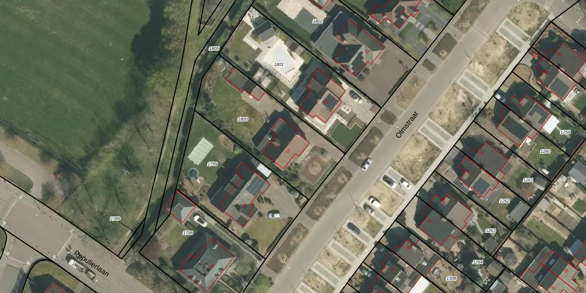 Het perceel waarop Olmstraat 57 staat heeft een oppervlakte van 1069 m². Dit is een zeer groot perceel. De perceeloppervlakte wordt geregistreerd door het Kadaster. Gedetailleerde informatie over de maten van dit perceel kunt u vinden in het rapport Kadastrale kaart met maatvoering van Olmstraat 57.