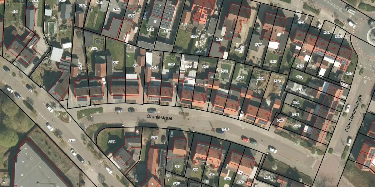 Het perceel waarop Oranjestraat 13 staat heeft een oppervlakte van 265 m². Dit is een middelgroot perceel. De perceeloppervlakte wordt geregistreerd door het Kadaster. Gedetailleerde informatie over de maten van dit perceel kunt u vinden in het rapport Kadastrale kaart met maatvoering van Oranjestraat 13.