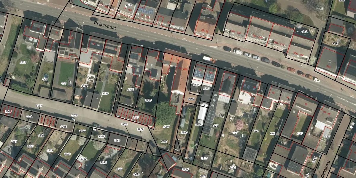 Het perceel waarop Peijerstraat 28-D staat heeft een oppervlakte van 755 m². Dit is een groot perceel. De perceeloppervlakte wordt geregistreerd door het Kadaster. Gedetailleerde informatie over de maten van dit perceel kunt u vinden in het rapport Kadastrale kaart met maatvoering van Peijerstraat 28-D.