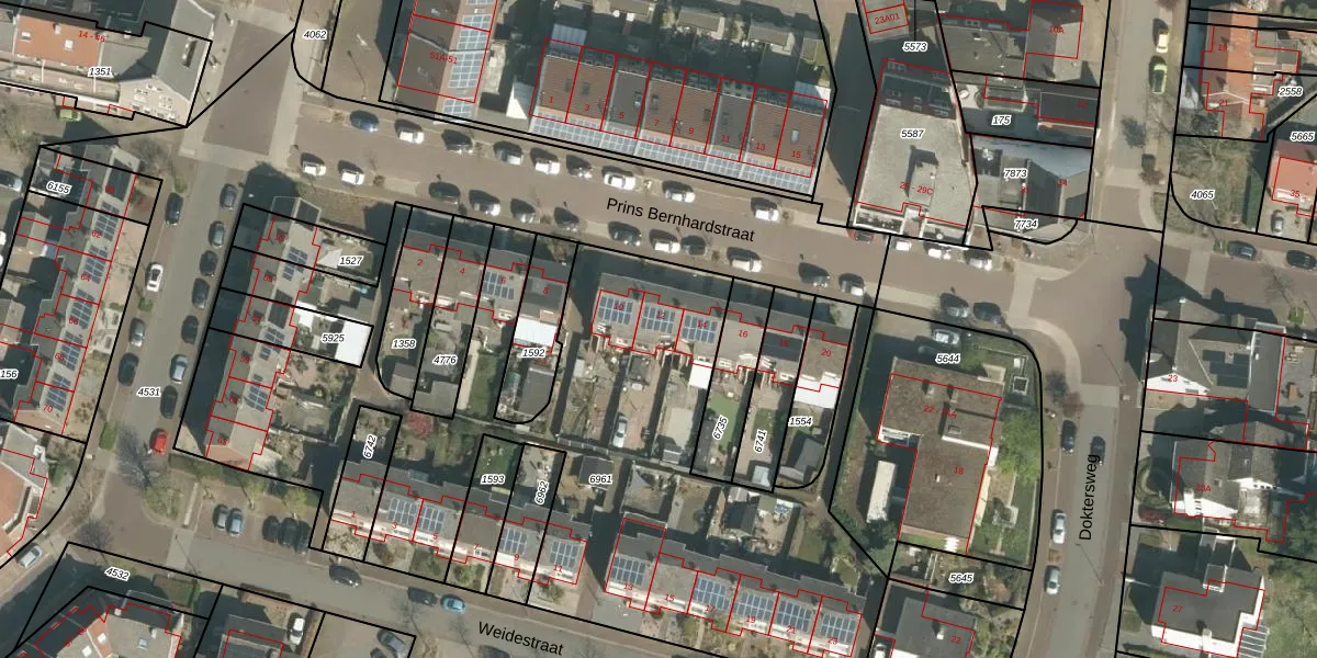 Het perceel waarop Prins Bernhardstraat 12 staat heeft een oppervlakte van 3400 m². Dit is een zeer groot perceel. De perceeloppervlakte wordt geregistreerd door het Kadaster. Gedetailleerde informatie over de maten van dit perceel kunt u vinden in het rapport Kadastrale kaart met maatvoering van Prins Bernhardstraat 12.