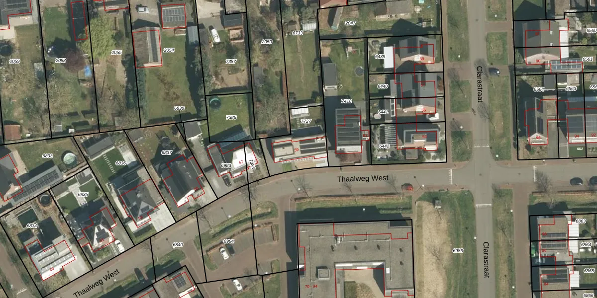Het perceel waarop Thaalweg West 59 staat heeft een oppervlakte van 370 m². Dit is een groot perceel. De perceeloppervlakte wordt geregistreerd door het Kadaster. Gedetailleerde informatie over de maten van dit perceel kunt u vinden in het rapport Kadastrale kaart met maatvoering van Thaalweg West 59.