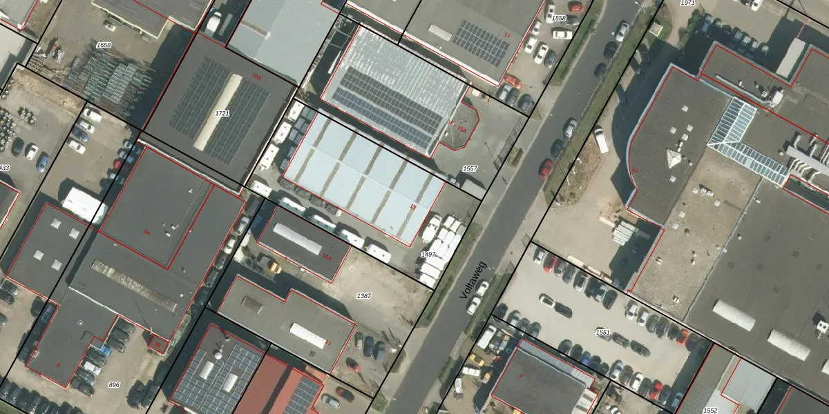 Het perceel waarop Voltaweg 13 staat heeft een oppervlakte van 1272 m². Dit is een zeer groot perceel. De perceeloppervlakte wordt geregistreerd door het Kadaster. Gedetailleerde informatie over de maten van dit perceel kunt u vinden in het rapport Kadastrale kaart met maatvoering van Voltaweg 13.