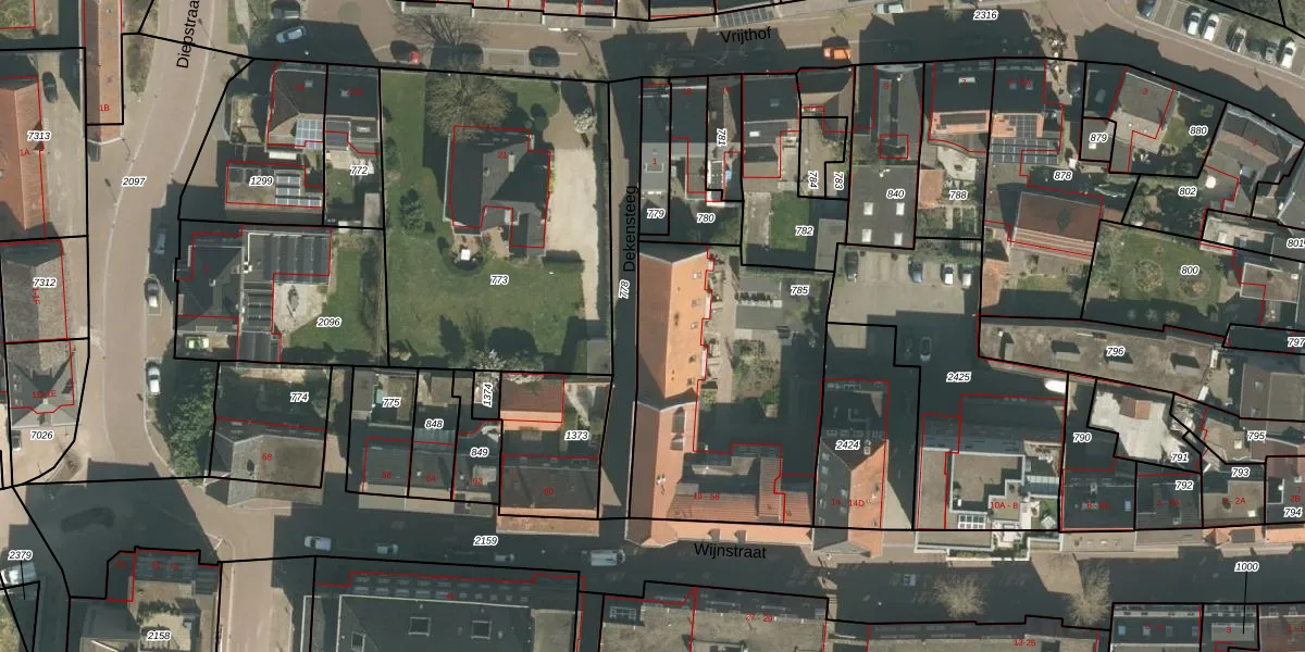 Het perceel waarop Wijnstraat 30 staat heeft een oppervlakte van 1215 m². Dit is een zeer groot perceel. De perceeloppervlakte wordt geregistreerd door het Kadaster. Gedetailleerde informatie over de maten van dit perceel kunt u vinden in het rapport Kadastrale kaart met maatvoering van Wijnstraat 30.