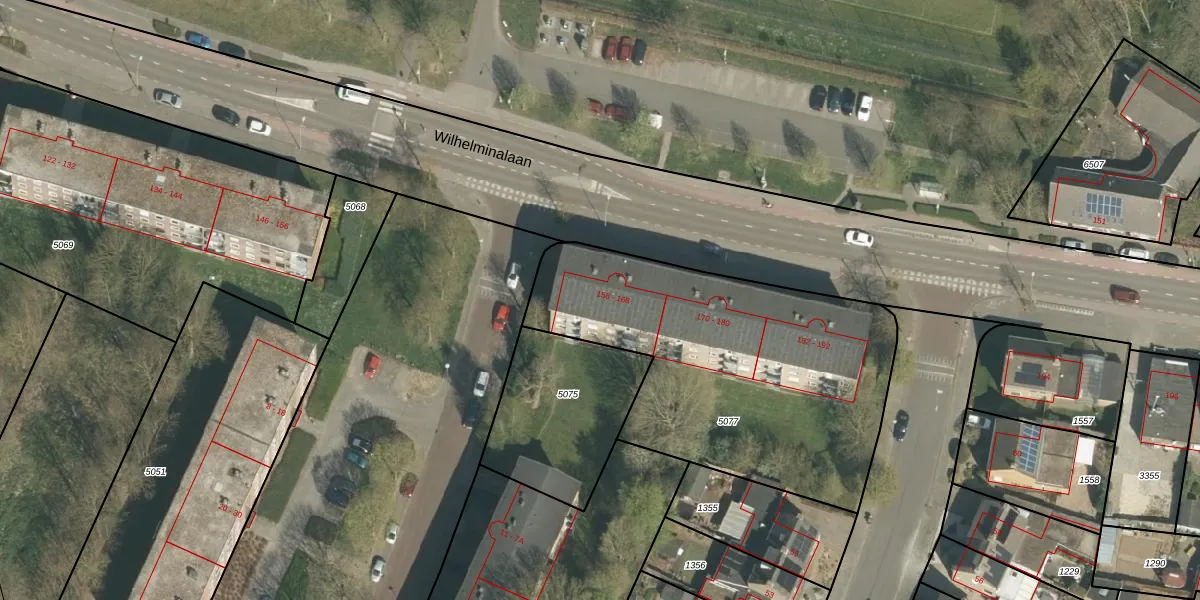 Het perceel waarop Wilhelminalaan 158 staat heeft een oppervlakte van 1655 m². Dit is een zeer groot perceel. De perceeloppervlakte wordt geregistreerd door het Kadaster. Gedetailleerde informatie over de maten van dit perceel kunt u vinden in het rapport Kadastrale kaart met maatvoering van Wilhelminalaan 158.