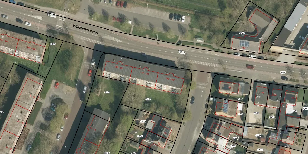 Het perceel waarop Wilhelminalaan 176 staat heeft een oppervlakte van 1655 m². Dit is een zeer groot perceel. De perceeloppervlakte wordt geregistreerd door het Kadaster. Gedetailleerde informatie over de maten van dit perceel kunt u vinden in het rapport Kadastrale kaart met maatvoering van Wilhelminalaan 176.
