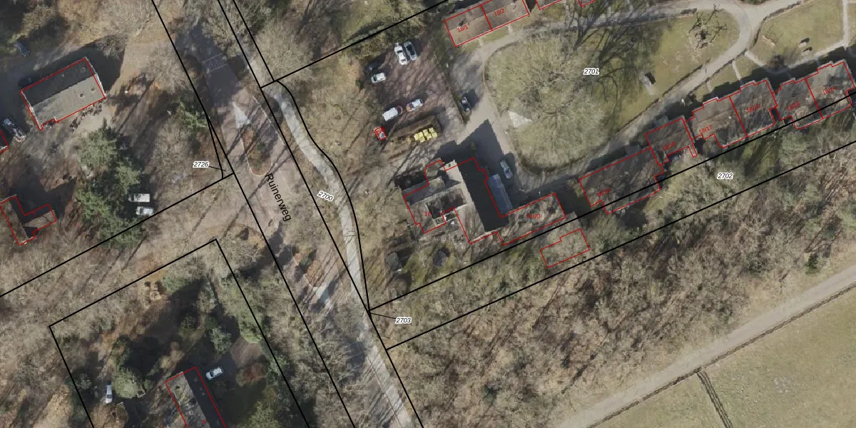 Het perceel waarop het adres ligt is RNN02-F-2701. De afkorting 'RNN02' staat voor kadastrale gemeente Ruinen. Het perceel is kleiner dan gemiddeld in Ruinen. Het perceel is 7827 m² groot, terwijl het gemiddelde ligt op 1,2 ha. Het kleinste perceel in de kadastrale gemeente is 0 m² groot. De grootste perceeloppervlakte is 2,67 km². Op het perceel zijn 17 adressen aanwezig. In de Basisregistratie Kadaster (BRK) werden de grenzen van het perceel geregistreerd op 10-10-2022.