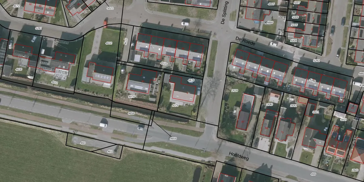 Het perceel waarop De Splitting 1 staat heeft een oppervlakte van 485 m². Dit is een groot perceel. De perceeloppervlakte wordt geregistreerd door het Kadaster. Gedetailleerde informatie over de maten van dit perceel kunt u vinden in het rapport Kadastrale kaart met maatvoering van De Splitting 1.