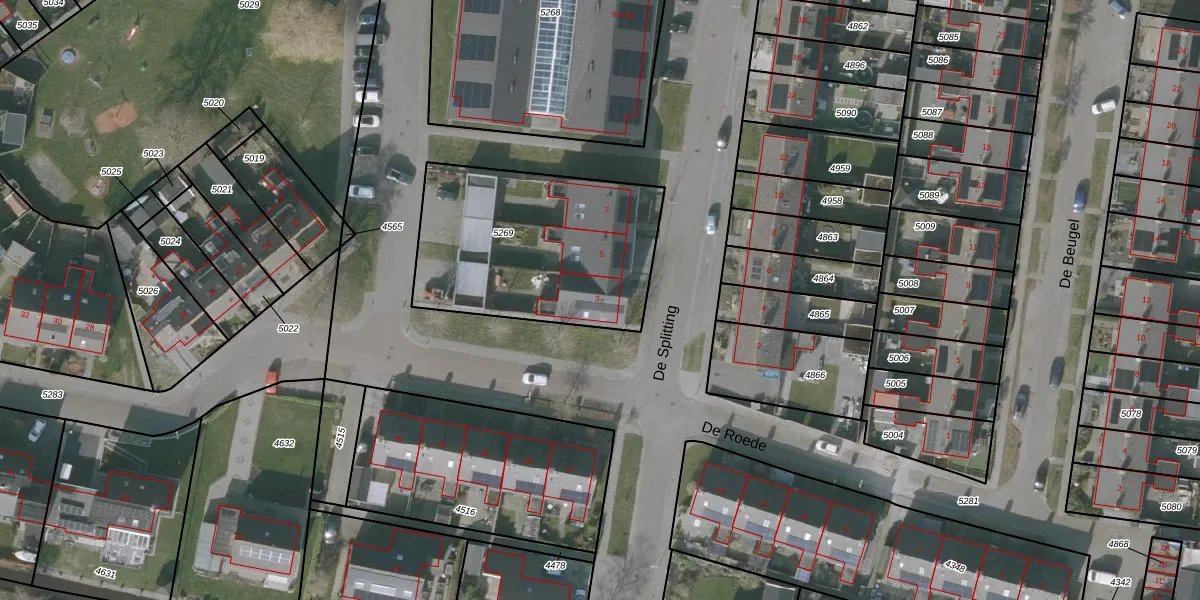 Het perceel waarop De Splitting 3 staat heeft een oppervlakte van 955 m². Dit is een groot perceel. De perceeloppervlakte wordt geregistreerd door het Kadaster. Gedetailleerde informatie over de maten van dit perceel kunt u vinden in het rapport Kadastrale kaart met maatvoering van De Splitting 3.