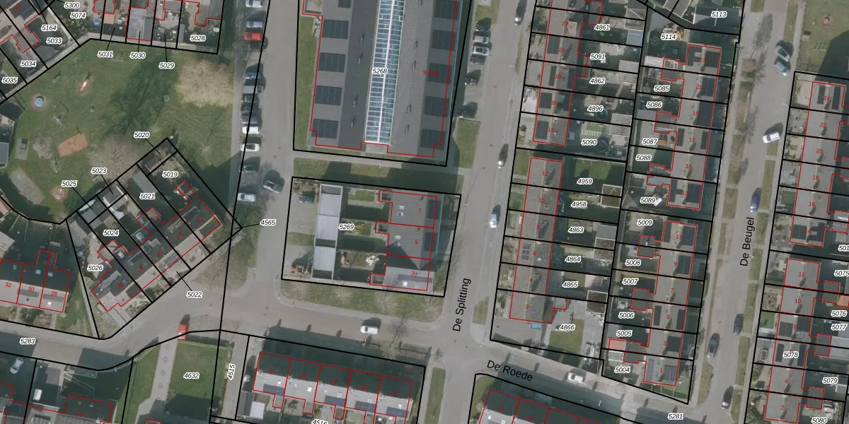 Het perceel waarop De Splitting 7 staat heeft een oppervlakte van 955 m². Dit is een groot perceel. De perceeloppervlakte wordt geregistreerd door het Kadaster. Gedetailleerde informatie over de maten van dit perceel kunt u vinden in het rapport Kadastrale kaart met maatvoering van De Splitting 7.