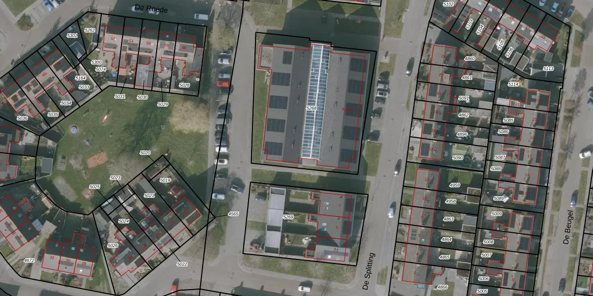 Het perceel waarop De Splitting 9-5 staat heeft een oppervlakte van 1660 m². Dit is een zeer groot perceel. De perceeloppervlakte wordt geregistreerd door het Kadaster. Gedetailleerde informatie over de maten van dit perceel kunt u vinden in het rapport Kadastrale kaart met maatvoering van De Splitting 9-5.