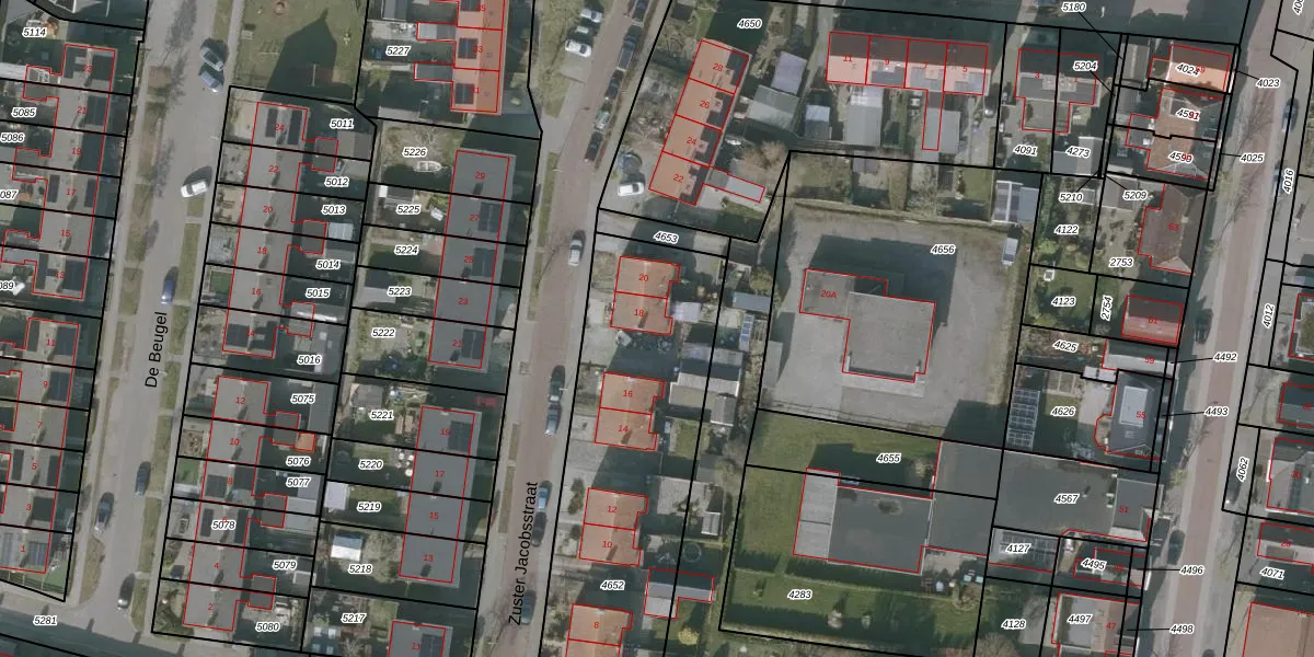 Het perceel waarop Zuster Jacobsstraat 18 staat heeft een oppervlakte van 1667 m². Dit is een zeer groot perceel. De perceeloppervlakte wordt geregistreerd door het Kadaster. Gedetailleerde informatie over de maten van dit perceel kunt u vinden in het rapport Kadastrale kaart met maatvoering van Zuster Jacobsstraat 18.