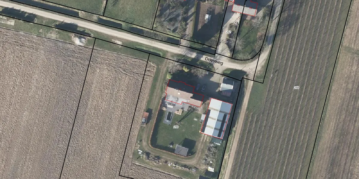 Het perceel waarop Driesweg 1 staat heeft een oppervlakte van 3688 m². Dit is een zeer groot perceel. De perceeloppervlakte wordt geregistreerd door het Kadaster. Gedetailleerde informatie over de maten van dit perceel kunt u vinden in het rapport Kadastrale kaart met maatvoering van Driesweg 1.