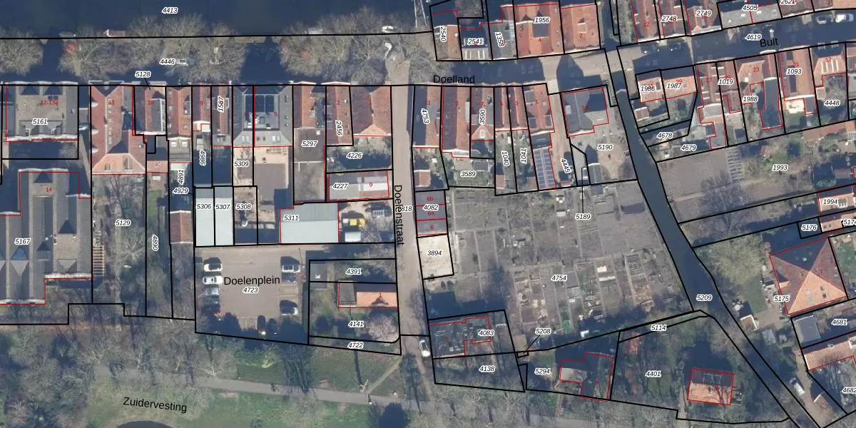 Het perceel waarop Doelenstraat 6-a staat heeft een oppervlakte van 74 m². Dit is een klein perceel. De perceeloppervlakte wordt geregistreerd door het Kadaster. Gedetailleerde informatie over de maten van dit perceel kunt u vinden in het rapport Kadastrale kaart met maatvoering van Doelenstraat 6-a.